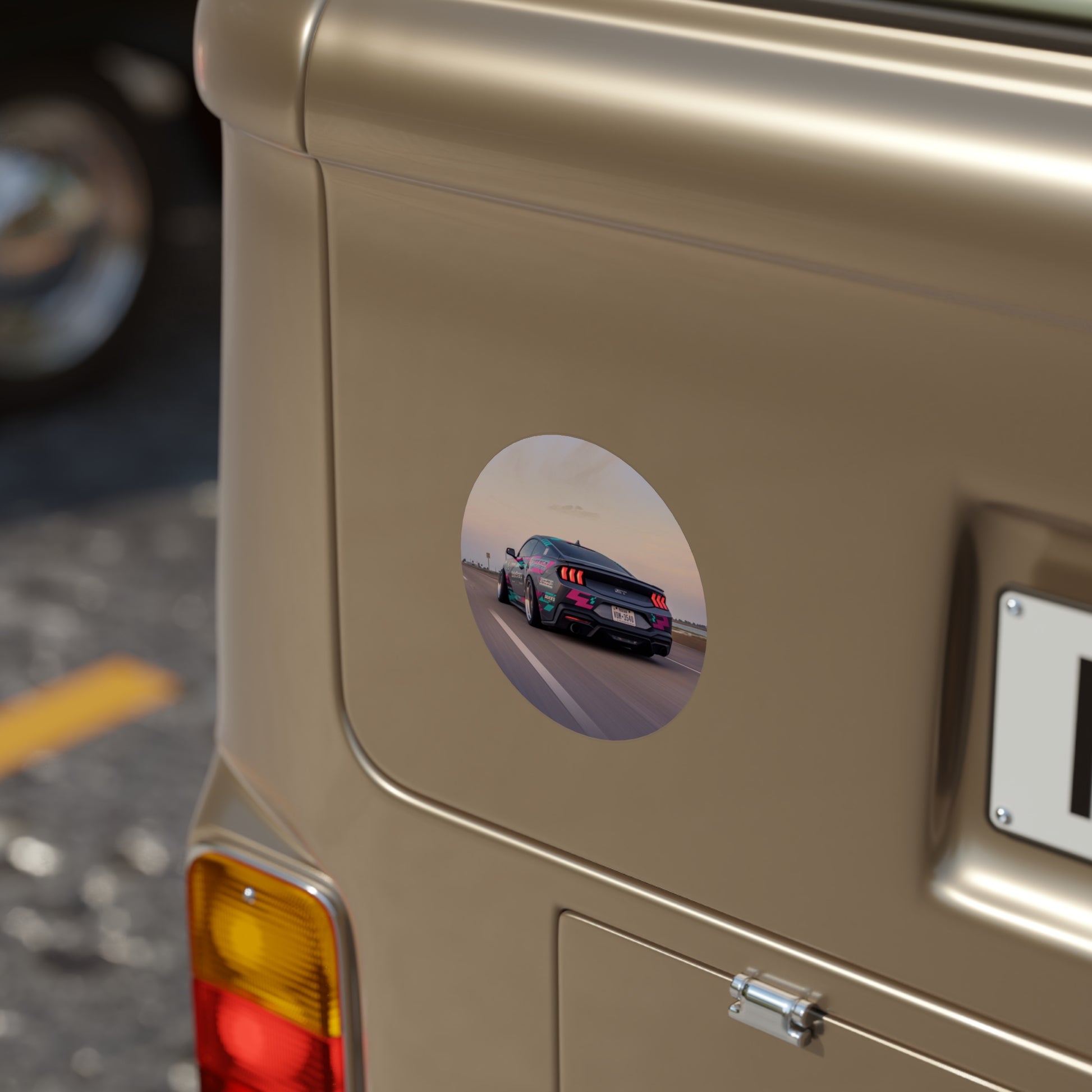 Round Transparent Car Sticker — Sunset Racing Mustang Design