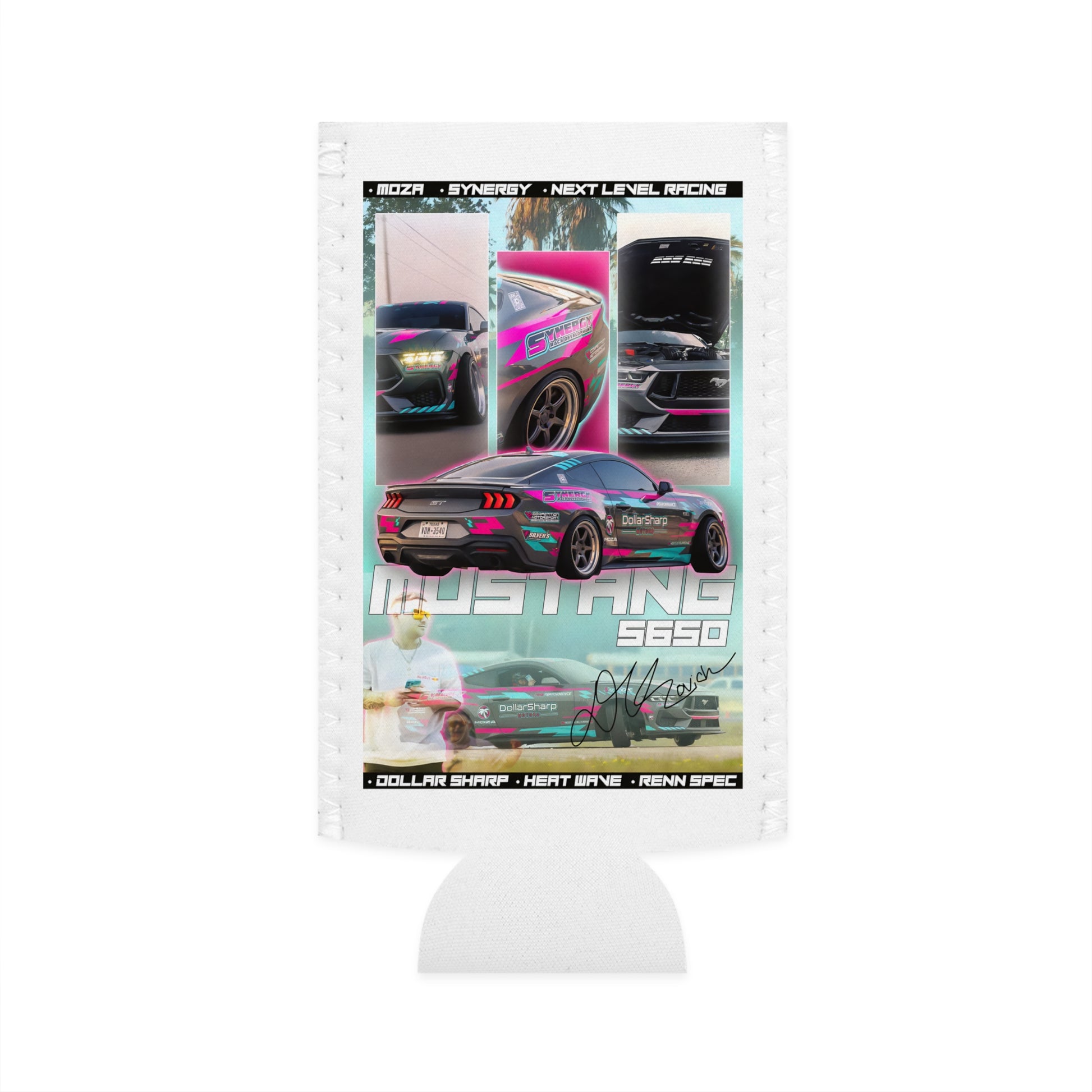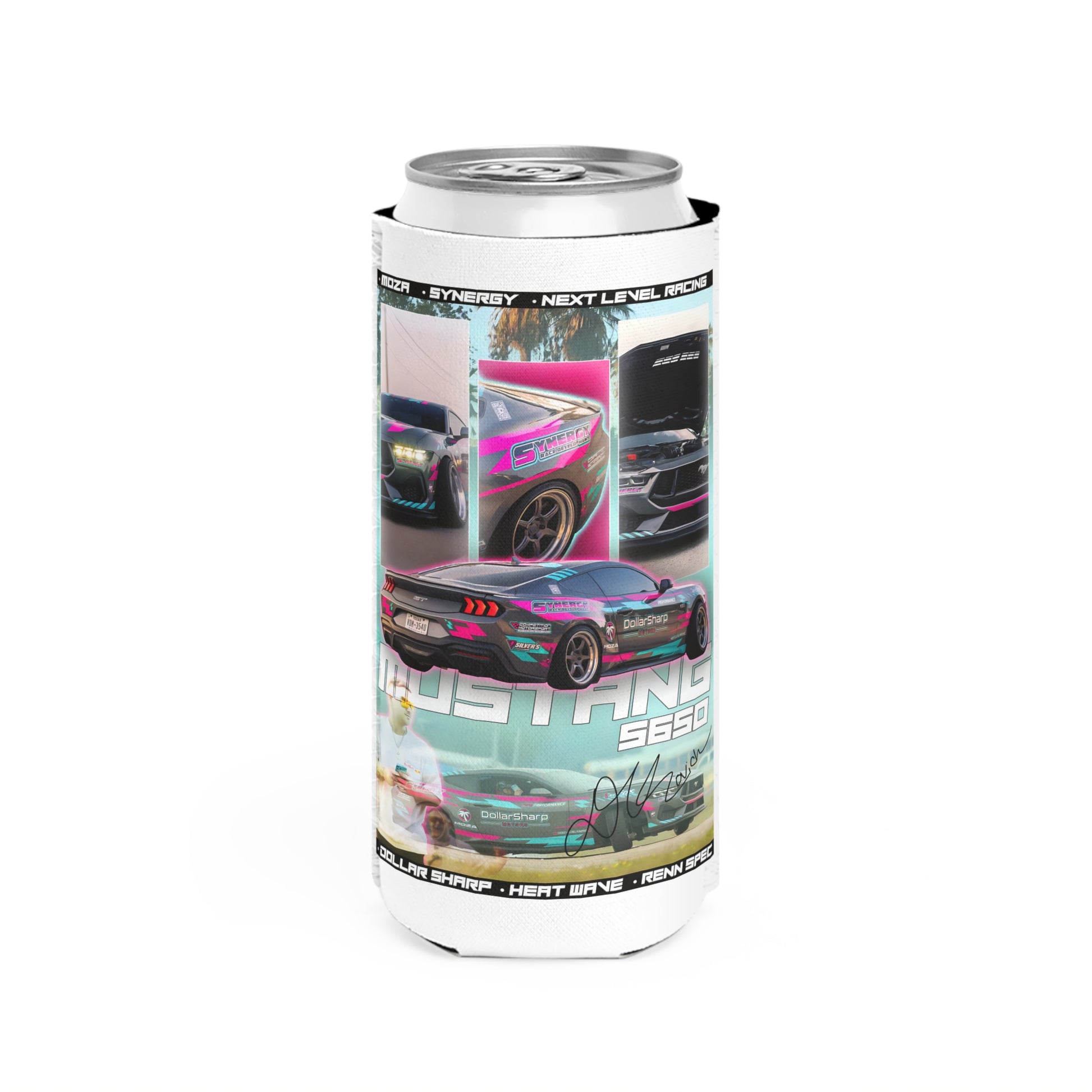 Race-day energy wrapped around your can. This slim neoprene cooler brings the garage to your hands — glossy, two-sided artwork of a neon-trimmed Mustang S650, sponsor logos, and magazine-style panels that feel like a poster you can sip from. It slips onto a 12oz slim can with a snug seal, insulating drinks so cold ones stay cold while you stand by the grid, wrench on a project, or watch night runs under LED glow. The bright printing and matched thread color keep the look cohesive; the white exterior with a black interior gives a crisp contrast that highlights the vivid design. Between crew meetups and track nights, this sleeve reads like a nod to car culture and keeps your drink quietly performing.